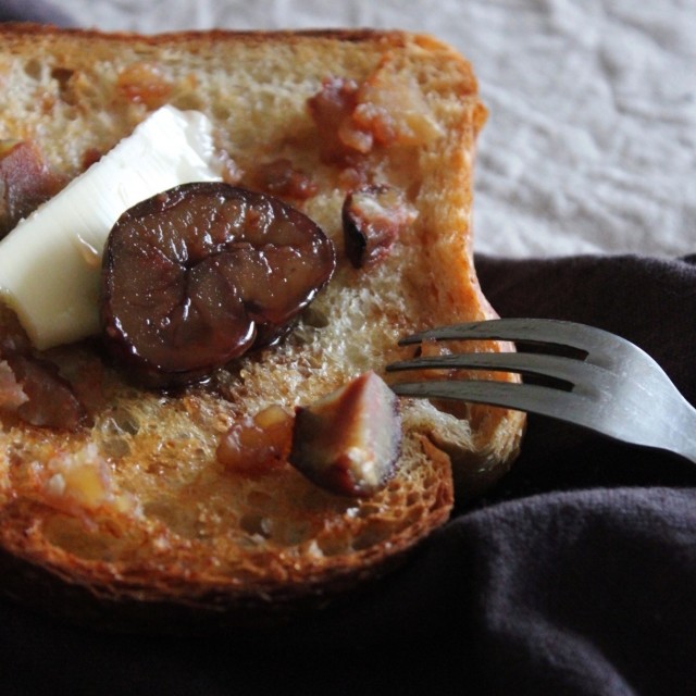 2.追いバターと栗の渋皮煮をランダムに潰したものを乗せて、ワイン色のシロップをたらり。